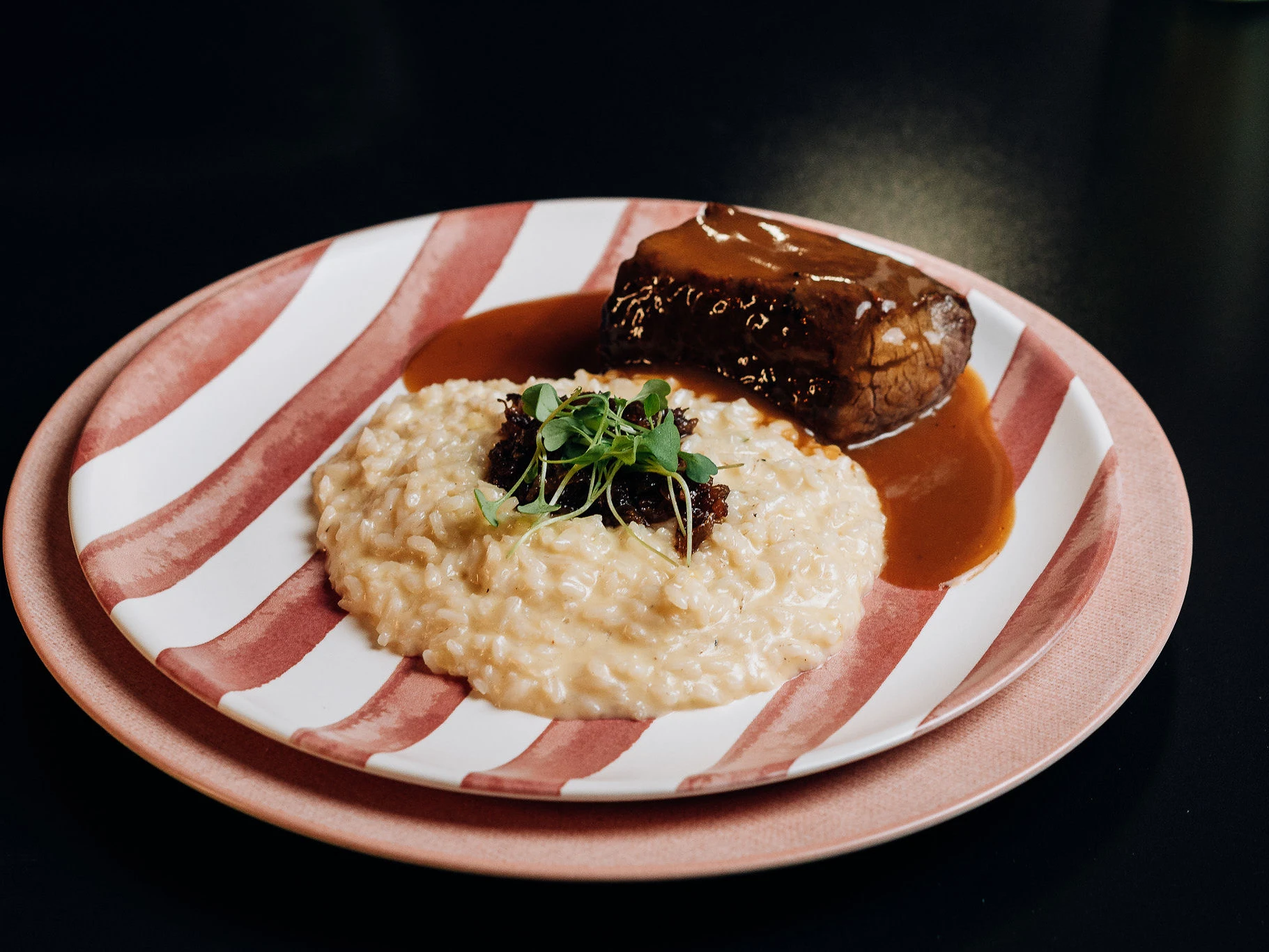 Risoto de parmesão finalizado na manteiga, extremamente cremoso, servido com medalhão de carne selado e coberto com molho encorpado de redução. Finalizado com brotos frescos para equilíbrio e aroma.