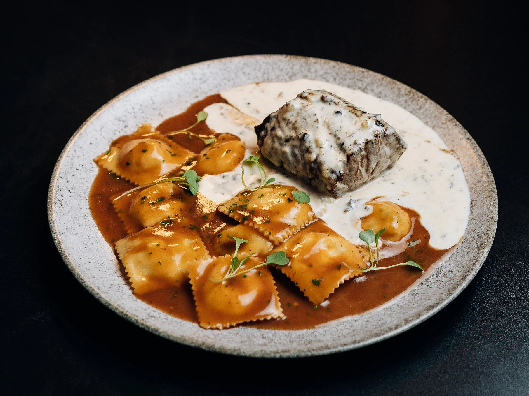 Raviolis artesanais envolvidos em combinação de molho encorpado e creme suave, acompanhados de filé grelhado com molho especial. Um prato intenso e reconfortante.
