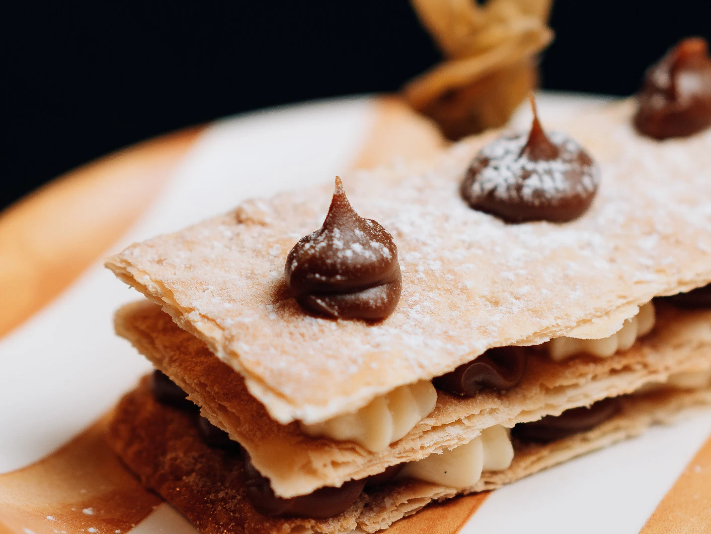 Camadas delicadas de massa folhada intercaladas com creme suave e ganache de chocolate, finalizadas com açúcar de confeiteiro e pontos de chocolate. Uma sobremesa leve, equilibrada e elegante.